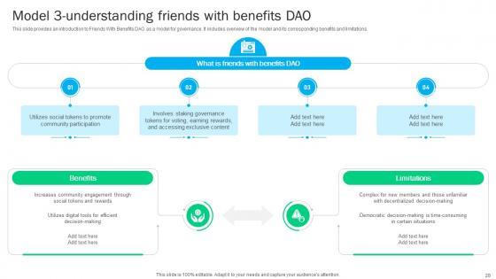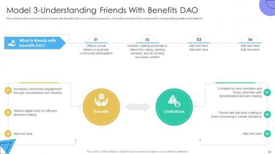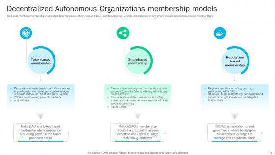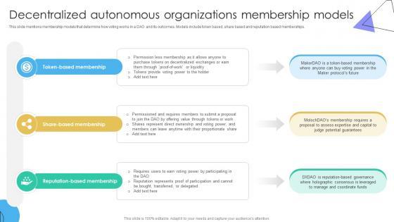 This slide mentions membership models that determine how voting works in a DAO and its outcomes. Models include token based, share based and reputation based memberships. Want to ace your presentation in front of a live audience Our A104 Guide To Understanding Decentralized Autonomous Organizations BCT SS V can help you do that by engaging all the users towards you. Slidegeeks experts have put their efforts and expertise into creating these impeccable powerpoint presentations so that you can communicate your ideas clearly. Moreover, all the templates are customizable, and easy-to-edit and downloadable. Use these for both personal and commercial use. This slide mentions membership models that determine how voting works in a DAO and its outcomes. Models include token based, share based and reputation based memberships.