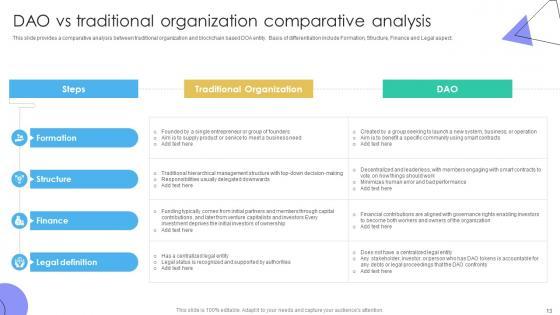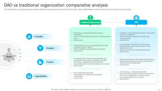 This slide provides a comparative analysis between traditional organization and blockchain based DOA entity. Basis of differentiation include Formation, Structure, Finance and Legal aspect. Do you have an important presentation coming up Are you looking for something that will make your presentation stand out from the rest Look no further than Guide To Understanding Decentralized DAO Vs Traditional Organization Comparative BCT SS V. With our professional designs, you can trust that your presentation will pop and make delivering it a smooth process. And with Slidegeeks, you can trust that your presentation will be unique and memorable. So why wait Grab Guide To Understanding Decentralized DAO Vs Traditional Organization Comparative BCT SS V today and make your presentation stand out from the rest This slide provides a comparative analysis between traditional organization and blockchain based DOA entity. Basis of differentiation include Formation, Structure, Finance and Legal aspect.