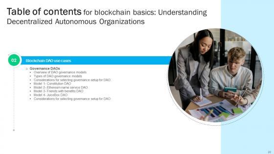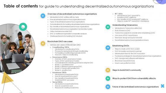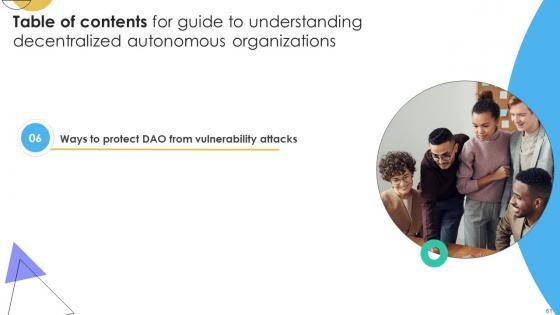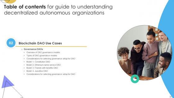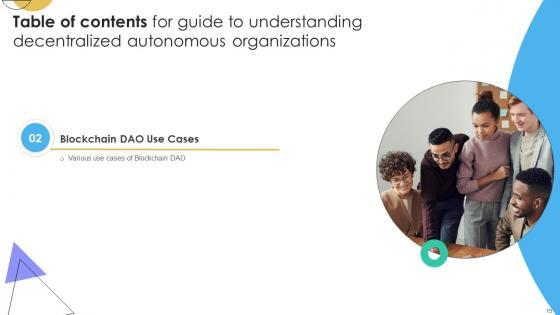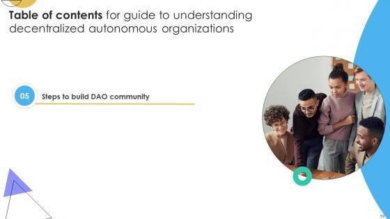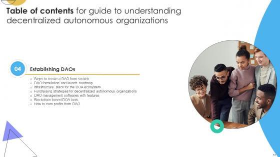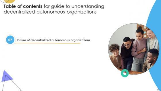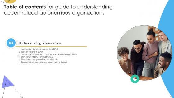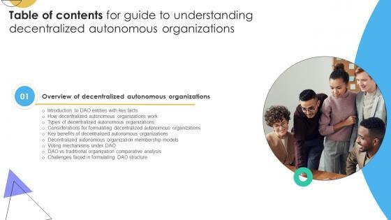 Crafting an eye-catching presentation has never been more straightforward. Let your presentation shine with this tasteful yet straightforward Table Of Contents For Guide To Understanding Decentralized Autonomous Organizations BCT SS V template. It offers a minimalistic and classy look that is great for making a statement. The colors have been employed intelligently to add a bit of playfulness while still remaining professional. Construct the ideal Table Of Contents For Guide To Understanding Decentralized Autonomous Organizations BCT SS V that effortlessly grabs the attention of your audience Begin now and be certain to wow your customers Our Table Of Contents For Guide To Understanding Decentralized Autonomous Organizations BCT SS V are topically designed to provide an attractive backdrop to any subject. Use them to look like a presentation pro.