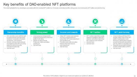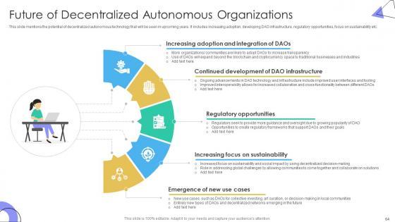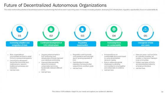This slide mentions the potential of decentralized autonomous technology that will be seen in upcoming years. It includes increasing adoption, developing DAO infrastructure, regulatory opportunities, focus on sustainability etc. If you are looking for a format to display your unique thoughts, then the professionally designed Guide To Understanding Decentralized Future Of Decentralized Autonomous Organizations BCT SS V is the one for you. You can use it as a Google Slides template or a PowerPoint template. Incorporate impressive visuals, symbols, images, and other charts. Modify or reorganize the text boxes as you desire. Experiment with shade schemes and font pairings. Alter, share or cooperate with other people on your work. Download Guide To Understanding Decentralized Future Of Decentralized Autonomous Organizations BCT SS V and find out how to give a successful presentation. Present a perfect display to your team and make your presentation unforgettable. This slide mentions the potential of decentralized autonomous technology that will be seen in upcoming years. It includes increasing adoption, developing DAO infrastructure, regulatory opportunities, focus on sustainability etc