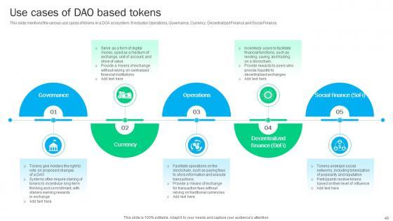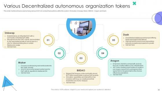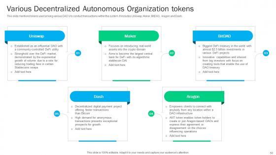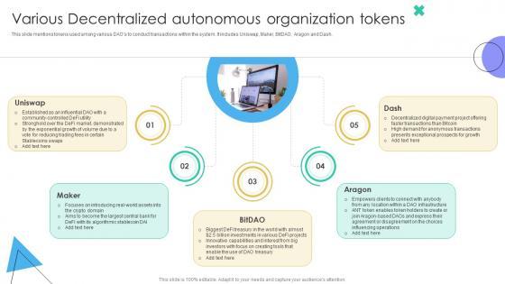 This slide mentions tokens used among various DAOs to conduct transactions within the system. It includes Uniswap, Maker, BitDAO, Aragon and Dash. Whether you have daily or monthly meetings, a brilliant presentation is necessary. Guide To Understanding Decentralized Various Decentralized Autonomous Organization Tokens BCT SS V can be your best option for delivering a presentation. Represent everything in detail using Guide To Understanding Decentralized Various Decentralized Autonomous Organization Tokens BCT SS V and make yourself stand out in meetings. The template is versatile and follows a structure that will cater to your requirements. All the templates prepared by Slidegeeks are easy to download and edit. Our research experts have taken care of the corporate themes as well. So, give it a try and see the results. This slide mentions tokens used among various DAOs to conduct transactions within the system. It includes Uniswap, Maker, BitDAO, Aragon and Dash.