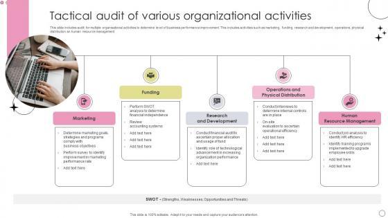 This slide includes audit for multiple organisational activities to determine level of business performance improvement. This includes activities such as marketing, funding, research and development, operations, physical distribution an human resource management. Pitch your topic with ease and precision using this Tactical Audit Of Various Organizational Activities Designs Pdf. This layout presents information on Marketing, Funding, Research And Development, Operations And Physical Distribution. It is also available for immediate download and adjustment. So, changes can be made in the color, design, graphics or any other component to create a unique layout. This slide includes audit for multiple organisational activities to determine level of business performance improvement. This includes activities such as marketing, funding, research and development, operations, physical distribution an human resource management.