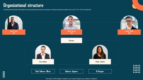 Following slide shows organizational structure of company that helps to understand roles and responsibility. It include roles such as CEO, co founder, head of finance, CTO etc. Welcome to our selection of the Project Management Software Capital Raising Deck Organizational Structure Template PDF. These are designed to help you showcase your creativity and bring your sphere to life. Planning and Innovation are essential for any business that is just starting out. This collection contains the designs that you need for your everyday presentations. All of our PowerPoints are 100 percent editable, so you can customize them to suit your needs. This multi purpose template can be used in various situations. Grab these presentation templates today.
