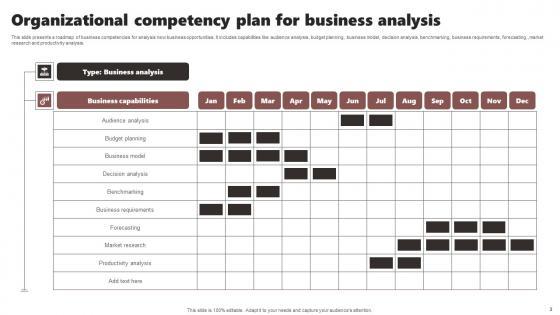 This slide presents a roadmap of business competencies for analysis new business opportunities. It includes capabilities like audience analysis, budget planning, business model, decision analysis, benchmarking, business requirements, forecasting, ,market research and productivity analysis. Pitch your topic with ease and precision using this Organizational Competency Plan For Business Analysis Elements Pdf. This layout presents information on Business Capabilities, Audience Analysis, Budget Planning. It is also available for immediate download and adjustment. So, changes can be made in the color, design, graphics or any other component to create a unique layout. This slide presents a roadmap of business competencies for analysis new business opportunities. It includes capabilities like audience analysis, budget planning, business model, decision analysis, benchmarking, business requirements, forecasting, ,market research and productivity analysis.