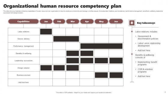 The slide shows a roadmap containing capabilities of human resource in an organization to improve employee productivity and manage workflow issues. It includes labor relations, service delivery, performance management, benefits and wellbeing, leadership succession and design solution. Showcasing this set of slides titled Organizational Human Resource Competency Plan Diagrams Pdf. The topics addressed in these templates are Harassment Discrimination Policies, Labor Union Relationship Development, Implementing Benefit Programs. All the content presented in this PPT design is completely editable. Download it and make adjustments in color, background, font etc. as per your unique business setting. The slide shows a roadmap containing capabilities of human resource in an organization to improve employee productivity and manage workflow issues. It includes labor relations, service delivery, performance management, benefits and wellbeing, leadership succession and design solution.