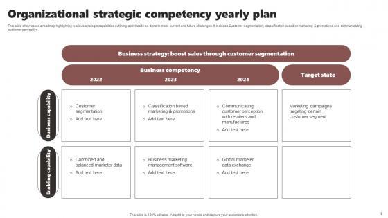 This slide showcases a roadmap highlighting various strategic capabilities outlining activities to be done to meet current and future challenges. It includes Customer segmentation, classification based on marketing and promotions and communicating customer perception. Showcasing this set of slides titled Organizational Strategic Competency Yearly Plan Guidelines Pdf. The topics addressed in these templates are Customer Segmentation, Classification Based, Communicating Customer Perception. All the content presented in this PPT design is completely editable. Download it and make adjustments in color, background, font etc. as per your unique business setting. This slide showcases a roadmap highlighting various strategic capabilities outlining activities to be done to meet current and future challenges. It includes Customer segmentation, classification based on marketing and promotions and communicating customer perception.