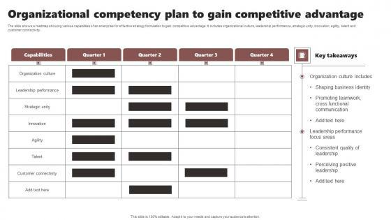 The slide shows a roadmap showing various capabilities of an enterprise for effective strategy formulation to gain competitive advantage. It includes organizational culture, leadership performance, strategic unity, innovation, agility, talent and customer connectivity. Showcasing this set of slides titled Organizational Competency Plan To Gain Competitive Advantage Guidelines Pdf. The topics addressed in these templates are Shaping Business Identity, Promoting Teamwork, Cross Functional Communication. All the content presented in this PPT design is completely editable. Download it and make adjustments in color, background, font etc. as per your unique business setting. The slide shows a roadmap showing various capabilities of an enterprise for effective strategy formulation to gain competitive advantage. It includes organizational culture, leadership performance, strategic unity, innovation, agility, talent and customer connectivity.