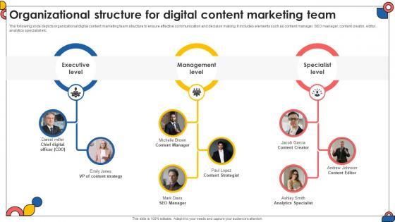 The following slide depicts organizational digital content marketing team structure to ensure effective communication and decision making. It includes elements such as content manager, SEO manager, content creator, editor, analytics specialist etc. Presenting this PowerPoint presentation, titled Organizational Structure For Digital Content Top Of The Funnel Digital Content Strategy SS V, with topics curated by our researchers after extensive research. This editable presentation is available for immediate download and provides attractive features when used. Download now and captivate your audience. Presenting this Organizational Structure For Digital Content Top Of The Funnel Digital Content Strategy SS V. Our researchers have carefully researched and created these slides with all aspects taken into consideration. This is a completely customizable Organizational Structure For Digital Content Top Of The Funnel Digital Content Strategy SS V that is available for immediate downloading. Download now and make an impact on your audience. Highlight the attractive features available with our PPTs. The following slide depicts organizational digital content marketing team structure to ensure effective communication and decision making. It includes elements such as content manager, SEO manager, content creator, editor, analytics specialist etc.