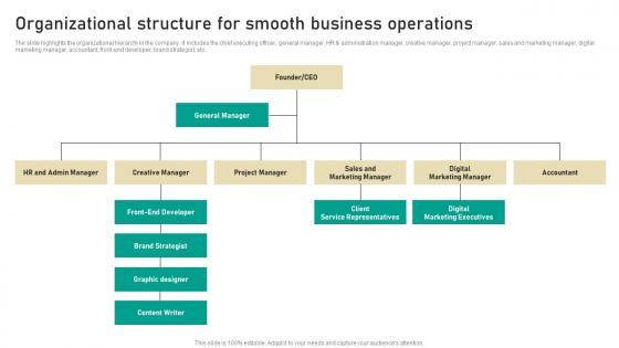 The slide highlights the organizational hierarchy in the company. It includes the chief executing officer, general manager, HR and administration manager, creative manager, project manager, sales and marketing manager, digital marketing manager, accountant, front-end developer, brand strategist, etc. The Organizational Structure For Smooth Business Operations Digital Marketing Business Graphics Pdf is a compilation of the most recent design trends as a series of slides. It is suitable for any subject or industry presentation, containing attractive visuals and photo spots for businesses to clearly express their messages. This template contains a variety of slides for the user to input data, such as structures to contrast two elements, bullet points, and slides for written information. Slidegeeks is prepared to create an impression. The slide highlights the organizational hierarchy in the company. It includes the chief executing officer, general manager, HR and administration manager, creative manager, project manager, sales and marketing manager, digital marketing manager, accountant, front-end developer, brand strategist, etc.