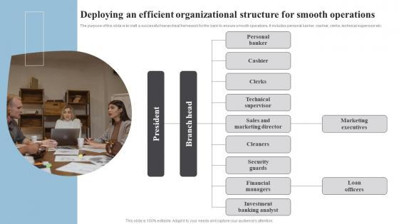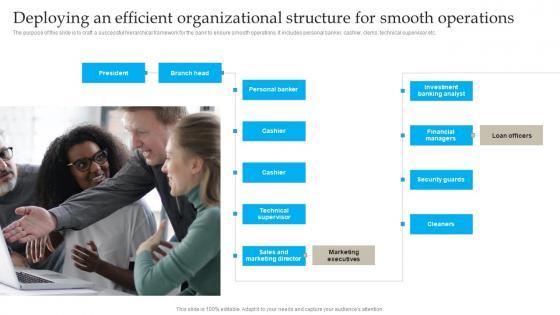The purpose of this slide is to craft a successful hierarchical framework for the bank to ensure smooth operations. It includes personal banker, cashier, clerks, technical supervisor etc. Present like a pro with Deploying An Efficient Organizational Banking Start Up B Plan Go To Market Strategy Guidelines Pdf Create beautiful presentations together with your team, using our easy to use presentation slides. Share your ideas in real time and make changes on the fly by downloading our templates. So whether you are in the office, on the go, or in a remote location, you can stay in sync with your team and present your ideas with confidence. With Slidegeeks presentation got a whole lot easier. Grab these presentations today. The purpose of this slide is to craft a successful hierarchical framework for the bank to ensure smooth operations. It includes personal banker, cashier, clerks, technical supervisor etc.