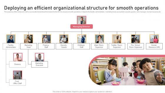 The purpose of this slide is to craft a successful hierarchical framework for the firm to ensure smooth operations. It depicts the facility administrator, marketing head, accountant, security guards, care manager, human resource etc. From laying roadmaps to briefing everything in detail, our templates are perfect for you. You can set the stage with your presentation slides. All you have to do is download these easy-to-edit and customizable templates. Deploying An Efficient Organizational Structure Childcare Business Plan Download Pdf will help you deliver an outstanding performance that everyone would remember and praise you for. Do download this presentation today. The purpose of this slide is to craft a successful hierarchical framework for the firm to ensure smooth operations. It depicts the facility administrator, marketing head, accountant, security guards, care manager, human resource etc.
