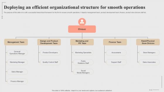 The purpose of this slide is to craft a successful hierarchical framework for the firm to ensure smooth operations. It depicts management team, product development team, finance, product store division staff etc. There are so many reasons you need a Deploying An Efficient Organizational Structure For Smooth Fashion Startup Roadmap Plan Ppt Slide BP SS V The first reason is you can not spend time making everything from scratch, Thus, Slidegeeks has made presentation templates for you too. You can easily download these templates from our website easily. The purpose of this slide is to craft a successful hierarchical framework for the firm to ensure smooth operations. It depicts management team, product development team, finance, product store division staff etc.