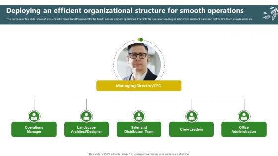 The purpose of this slide is to craft a successful hierarchical framework for the firm to ensure smooth operations. It depicts the operations manager, landscape architect, sales and distribution team, crew leaders etc. Get a simple yet stunning designed Sample Trugreen Business Plan Deploying An Efficient Organizational Structure For Smooth BP SS V. It is the best one to establish the tone in your meetings. It is an excellent way to make your presentations highly effective. So, download this PPT today from Slidegeeks and see the positive impacts. Our easy-to-edit Sample Trugreen Business Plan Deploying An Efficient Organizational Structure For Smooth BP SS V can be your go-to option for all upcoming conferences and meetings. So, what are you waiting for Grab this template today. The purpose of this slide is to craft a successful hierarchical framework for the firm to ensure smooth operations. It depicts the operations manager, landscape architect, sales and distribution team, crew leaders etc.