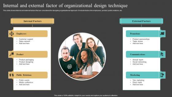 This slide shows internal and external factors that are considered for designing organizational Approach. It include factors like employees, product, public relations, etc. Pitch your topic with ease and precision using this Internal And External Factor Of Organizational Design Technique Template Pdf. This layout presents information on Employees, Product, Communications. It is also available for immediate download and adjustment. So, changes can be made in the color, design, graphics or any other component to create a unique layout. This slide shows internal and external factors that are considered for designing organizational Approach. It include factors like employees, product, public relations, etc.