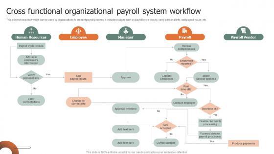 This slide shows chart which can be used by organizations to present payroll process. It includes stages such as payroll cycle closes, verify personal info, add payroll hours, etc. Showcasing this set of slides titled Cross Functional Organizational Payroll System Workflow Slides Pdf. The topics addressed in these templates are Human Resources, Employee, Manager. All the content presented in this PPT design is completely editable. Download it and make adjustments in color, background, font etc. as per your unique business setting. This slide shows chart which can be used by organizations to present payroll process. It includes stages such as payroll cycle closes, verify personal info, add payroll hours, etc.