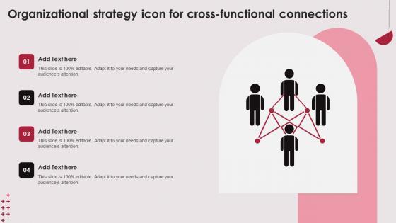Showcasing this set of slides titled Organizational Strategy Icon For Cross Functional Connections Microsoft PDF. The topics addressed in these templates are Organizational Strategy Icon, Cross Functional Connections. All the content presented in this PPT design is completely editable. Download it and make adjustments in color, background, font etc. as per your unique business setting. Our Organizational Strategy Icon For Cross Functional Connections Microsoft Pdf are topically designed to provide an attractive backdrop to any subject. Use them to look like a presentation pro.