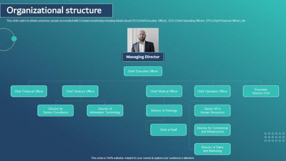Following slide showcases company hierarchical structure to understand roles and responsibilities. It includes members such as CEO, president, EVP, SVP,, chief compliance officer etc. Are you in need of a template that can accommodate all of your creative concepts This one is crafted professionally and can be altered to fit any style. Use it with Google Slides or PowerPoint. Include striking photographs, symbols, depictions, and other visuals. Fill, move around, or remove text boxes as desired. Test out color palettes and font mixtures. Edit and save your work, or work with colleagues. Download Organizational Structure Capital Raising Pitch Deck For Health Care Services Ppt Slide and observe how to make your presentation outstanding. Give an impeccable presentation to your group and make your presentation unforgettable. Following slide showcases company hierarchical structure to understand roles and responsibilities. It includes members such as CEO, president, EVP, SVP,, chief compliance officer etc.