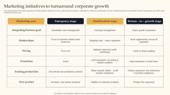 This slide provides information regarding marketing initiatives deployed by firm to utilize during emergency, stabilization or return to growth stage. The key marketing areas for consideration include market share, promotion, price, existing product line, etc. Present like a pro with Marketing Initiatives Turnaround Key Business Tactics For Organizational Success Introduction Pdf Create beautiful presentations together with your team, using our easy to use presentation slides. Share your ideas in real time and make changes on the fly by downloading our templates. So whether you are in the office, on the go, or in a remote location, you can stay in sync with your team and present your ideas with confidence. With Slidegeeks presentation got a whole lot easier. Grab these presentations today. This slide provides information regarding marketing initiatives deployed by firm to utilize during emergency, stabilization or return to growth stage. The key marketing areas for consideration include market share, promotion, price, existing product line, etc.