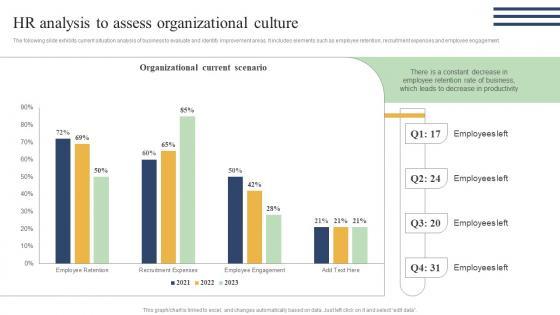 The following slide exhibits current situation analysis of business to evaluate and identify improvement areas. It includes elements such as employee retention, recruitment expenses and employee engagement. If you are looking for a format to display your unique thoughts, then the professionally designed Action Measures To Build Staff HR Analysis To Assess Organizational Culture Ideas Pdf is the one for you. You can use it as a Google Slides template or a PowerPoint template. Incorporate impressive visuals, symbols, images, and other charts. Modify or reorganize the text boxes as you desire. Experiment with shade schemes and font pairings. Alter, share or cooperate with other people on your work. Download Action Measures To Build Staff HR Analysis To Assess Organizational Culture Ideas Pdf and find out how to give a successful presentation. Present a perfect display to your team and make your presentation unforgettable. The following slide exhibits current situation analysis of business to evaluate and identify improvement areas. It includes elements such as employee retention, recruitment expenses and employee engagement.