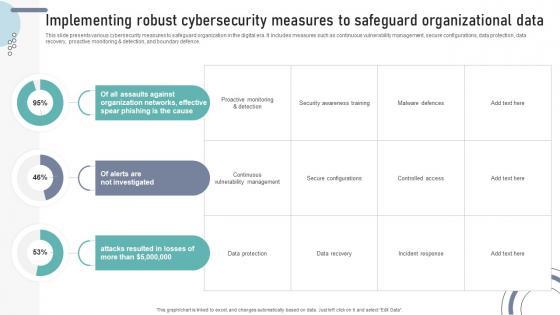 This slide presents various cybersecurity measures to safeguard organization in the digital era. It includes measures such as continuous vulnerability management, secure configurations, data protection, data recovery, proactive monitoring and detection, and boundary defence.Boost your pitch with our creative Implementing Robust Cybersecurity Measures To Safeguard Organizational Data DT SS V. Deliver an awe-inspiring pitch that will mesmerize everyone. Using these presentation templates you will surely catch everyones attention. You can browse the ppts collection on our website. We have researchers who are experts at creating the right content for the templates. So you do not have to invest time in any additional work. Just grab the template now and use them. This slide presents various cybersecurity measures to safeguard organization in the digital era. It includes measures such as continuous vulnerability management, secure configurations, data protection, data recovery, proactive monitoring and detection, and boundary defence.