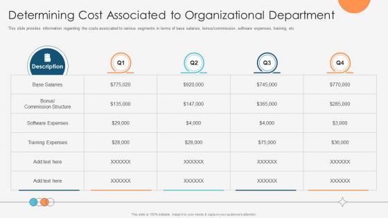 This slide provides information regarding the costs associated to various segments in terms of base salaries, bonus or commission, software expenses, training, etc. Present like a pro with Enhancing Profitability Modelling Determining Cost Associated To Organizational Department. Create beautiful presentations together with your team, using our easy-to-use presentation slides. Share your ideas in real-time and make changes on the fly by downloading our templates. So whether you are in the office, on the go, or in a remote location, you can stay in sync with your team and present your ideas with confidence. With Slidegeeks presentation got a whole lot easier. Grab these presentations today. This slide provides information regarding the costs associated to various segments in terms of base salaries, bonus or commission, software expenses, training, etc