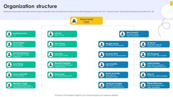 Mentioned slide provides information about company organisation chart. It includes key members names with designations such as CEO, CFO, General counsel , Global talent Development, operations and IT, etc.Retrieve professionally designed Organization Structure Medical Research And Development Company Profile CP SS V to effectively convey your message and captivate your listeners. Save time by selecting pre-made slideshows that are appropriate for various topics, from business to educational purposes. These themes come in many different styles, from creative to corporate, and all of them are easily adjustable and can be edited quickly. Access them as PowerPoint templates or as Google Slides themes. You do not have to go on a hunt for the perfect presentation because Slidegeeks got you covered from everywhere. Mentioned slide provides information about company organisation chart. It includes key members names with designations such as CEO, CFO, General counsel , Global talent Development, operations and IT, etc.