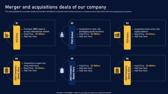 This slide highlights the successful merger and acquisition with different companies which includes deals price, company purchase stake and to enter into packaging goods business. The Merger And Acquisitions Deals Multinational Organization Customer Goods Topics Pdf is a compilation of the most recent design trends as a series of slides. It is suitable for any subject or industry presentation, containing attractive visuals and photo spots for businesses to clearly express their messages. This template contains a variety of slides for the user to input data, such as structures to contrast two elements, bullet points, and slides for written information. Slidegeeks is prepared to create an impression. This slide highlights the successful merger and acquisition with different companies which includes deals price, company purchase stake and to enter into packaging goods business.