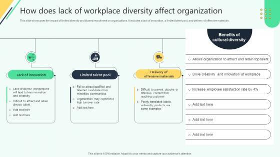 This slide showcases the impact of limited diversity and biased recruitment on organizations. It includes a lack of innovation, a limited talent pool, and delivery of offensive materials. Welcome to our selection of the How Does Lack Of Workplace Diversity Affect Organization Analysing Hr Data For Effective Decision Making. These are designed to help you showcase your creativity and bring your sphere to life. Planning and Innovation are essential for any business that is just starting out. This collection contains the designs that you need for your everyday presentations. All of our PowerPoints are 100 percent editable, so you can customize them to suit your needs. This multi-purpose template can be used in various situations. Grab these presentation templates today. This slide showcases the impact of limited diversity and biased recruitment on organizations. It includes a lack of innovation, a limited talent pool, and delivery of offensive materials.