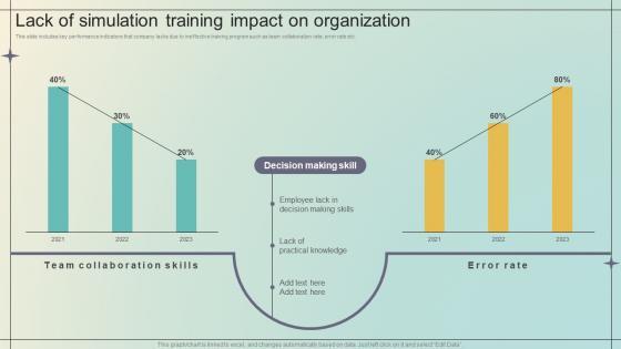 This slide includes key performance indicators that company lacks due to ineffective training program such as team collaboration rate, error rate etc. If you are looking for a format to display your unique thoughts, then the professionally designed Immersive Training For Practical Lack Of Simulation Training Impact On Organization DTE SS V is the one for you. You can use it as a Google Slides template or a PowerPoint template. Incorporate impressive visuals, symbols, images, and other charts. Modify or reorganize the text boxes as you desire. Experiment with shade schemes and font pairings. Alter, share or cooperate with other people on your work. Download Immersive Training For Practical Lack Of Simulation Training Impact On Organization DTE SS V and find out how to give a successful presentation. Present a perfect display to your team and make your presentation unforgettable. This slide includes key performance indicators that company lacks due to ineffective training program such as team collaboration rate, error rate etc.