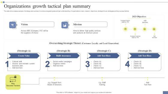 The slide showcases a sample of strategy plan summary to achieve targeted goals and get understanding of organizations vision, mission, objectives, strategic thrust, strategies and key sucess factors. Showcasing this set of slides titled Organizations Growth Tactical Plan Summary Mockup Pdf. The topics addressed in these templates are Build Awareness, Organizations Growth, Tactical Plan Summary. All the content presented in this PPT design is completely editable. Download it and make adjustments in color, background, font etc. as per your unique business setting. The slide showcases a sample of strategy plan summary to achieve targeted goals and get understanding of organizations vision, mission, objectives, strategic thrust, strategies and key sucess factors.