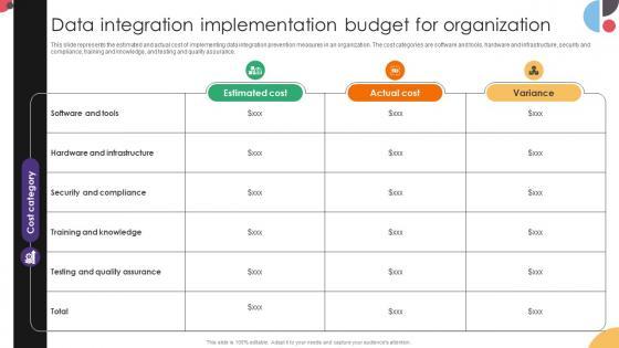 This slide represents the estimated and actual cost of implementing data integration prevention measures in an organization. The cost categories are software and tools, hardware and infrastructure, security and compliance, training and knowledge, and testing and quality assurance. If your project calls for a presentation, then Slidegeeks is your go-to partner because we have professionally designed, easy-to-edit templates that are perfect for any presentation. After downloading, you can easily edit Data Integration Implementation Budget For Organization Data Integration Strategies For Business and make the changes accordingly. You can rearrange slides or fill them with different images. Check out all the handy templates This slide represents the estimated and actual cost of implementing data integration prevention measures in an organization. The cost categories are software and tools, hardware and infrastructure, security and compliance, training and knowledge, and testing and quality assurance.