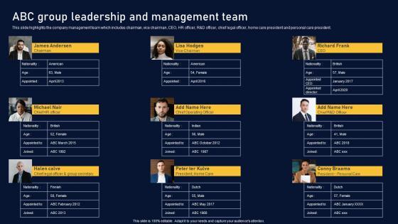 This slide highlights the company management team which includes chairman, vice chairman, CEO, HR officer, RandD officer, chief legal officer, home care president and personal care president. Do you know about Slidesgeeks ABC Group Leadership And Multinational Organization Customer Goods Ideas Pdf These are perfect for delivering any kind od presentation. Using it, create PowerPoint presentations that communicate your ideas and engage audiences. Save time and effort by using our pre designed presentation templates that are perfect for a wide range of topic. Our vast selection of designs covers a range of styles, from creative to business, and are all highly customizable and easy to edit. Download as a PowerPoint template or use them as Google Slides themes. This slide highlights the company management team which includes chairman, vice chairman, CEO, HR officer, RandD officer, chief legal officer, home care president and personal care president.