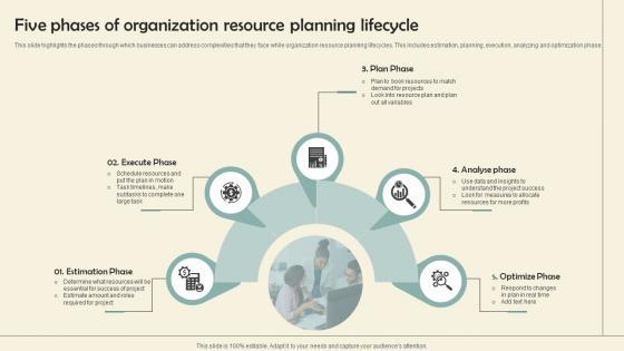 This slide highlights the phases through which businesses can address complexities that they face while organization resource planning lifecycles. This includes estimation, planning, execution, analyzing and optimization phase.Pitch your topic with ease and precision using this Five Phases Of Organization Resource Planning Lifecycle Pictures Pdf This layout presents information on Estimation Phase, Execute Phase, Analyse Phase It is also available for immediate download and adjustment. So, changes can be made in the color, design, graphics or any other component to create a unique layout. This slide highlights the phases through which businesses can address complexities that they face while organization resource planning lifecycles. This includes estimation, planning, execution, analyzing and optimization phase.