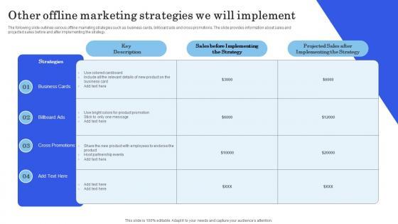 The following slide outlines various offline marketing strategies such as business cards, billboard ads and cross promotions. The slide provides information about sales and projected sales before and after implementing the strategy. The Launching New Commodity Other Offline Marketing Strategies We Will Implement Graphics Pdf is a compilation of the most recent design trends as a series of slides. It is suitable for any subject or industry presentation, containing attractive visuals and photo spots for businesses to clearly express their messages. This template contains a variety of slides for the user to input data, such as structures to contrast two elements, bullet points, and slides for written information. Slidegeeks is prepared to create an impression. The following slide outlines various offline marketing strategies such as business cards, billboard ads and cross promotions. The slide provides information about sales and projected sales before and after implementing the strategy.