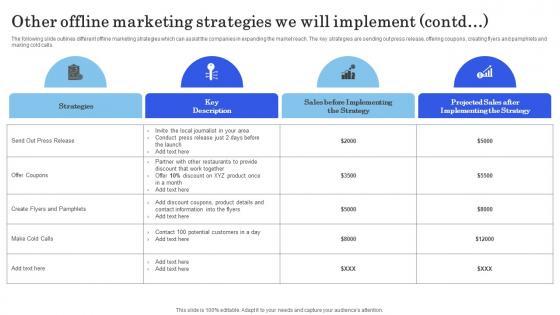 The following slide outlines different offline marketing strategies which can assist the companies in expanding the market reach. The key strategies are sending out press release, offering coupons, creating flyers and pamphlets and making cold calls. Are you in need of a template that can accommodate all of your creative concepts This one is crafted professionally and can be altered to fit any style. Use it with Google Slides or PowerPoint. Include striking photographs, symbols, depictions, and other visuals. Fill, move around, or remove text boxes as desired. Test out color palettes and font mixtures. Edit and save your work, or work with colleagues. Download Introducing New Food Commodity Other Offline Marketing Strategies We Will Microsoft PDF and observe how to make your presentation outstanding. Give an impeccable presentation to your group and make your presentation unforgettable.