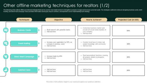 The following slide outlines offline promotional strategies that can be used by real estate brokers to strengthen companys image and increase customer loyalty. The strategies outlined in slide are designing business cards, event hosting, and direct mail campaign. It also provides information about goal, ways to achieve, and expected cost of implementing each strategy. Slidegeeks is one of the best resources for PowerPoint templates. You can download easily and regulate Other Offline Marketing Techniques For Realtors Strategic Real Estate Structure Pdf for your personal presentations from our wonderful collection. A few clicks is all it takes to discover and get the most relevant and appropriate templates. Use our Templates to add a unique zing and appeal to your presentation and meetings. All the slides are easy to edit and you can use them even for advertisement purposes. The following slide outlines offline promotional strategies that can be used by real estate brokers to strengthen companys image and increase customer loyalty. The strategies outlined in slide are designing business cards, event hosting, and direct mail campaign. It also provides information about goal, ways to achieve, and expected cost of implementing each strategy.