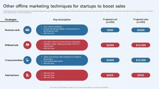The following slide showcases traditional marketing strategies through which sales representatives can target specific customers and increase companys revenue. The slide covers information about strategies such as business cards, billboard ads, and cross promotions. Retrieve professionally designed Other Offline Marketing Techniques For Startups To Boost Sales Effective GTM Techniques Background PDF to effectively convey your message and captivate your listeners. Save time by selecting pre-made slideshows that are appropriate for various topics, from business to educational purposes. These themes come in many different styles, from creative to corporate, and all of them are easily adjustable and can be edited quickly. Access them as PowerPoint templates or as Google Slides themes. You do not have to go on a hunt for the perfect presentation because Slidegeeks got you covered from everywhere. The following slide showcases traditional marketing strategies through which sales representatives can target specific customers and increase companys revenue. The slide covers information about strategies such as business cards, billboard ads, and cross promotions.