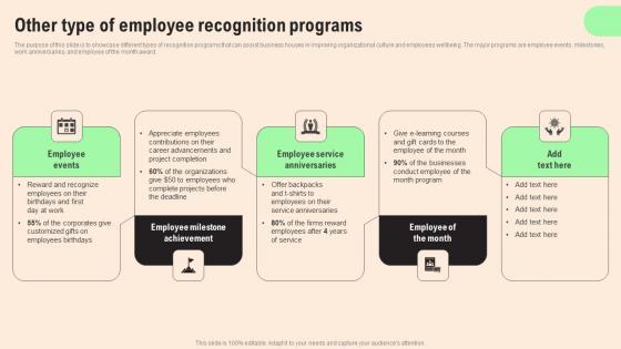 The purpose of this slide is to showcase different types of recognition programs that can assist business houses in improving organizational culture and employees wellbeing. The major programs are employee events, milestones, work anniversaries, and employee of the month award. If your project calls for a presentation, then Slidegeeks is your go-to partner because we have professionally designed, easy-to-edit templates that are perfect for any presentation. After downloading, you can easily edit Other Type Of Employee Recognition Programs Developing Employee Retention Techniques To Minimize Turnover Rate Structure PDF and make the changes accordingly. You can rearrange slides or fill them with different images. Check out all the handy templates