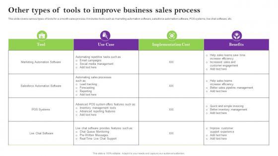 This slide covers various types of tools for a smooth sales process. It includes tools such as marketing automation software, salesforce automation software, POS systems, live chat software, etc. Do you know about Slidesgeeks Other Types Of Tools To Improve Business Sales Techniques For Achieving Microsoft Pdf These are perfect for delivering any kind od presentation. Using it, create PowerPoint presentations that communicate your ideas and engage audiences. Save time and effort by using our pre designed presentation templates that are perfect for a wide range of topic. Our vast selection of designs covers a range of styles, from creative to business, and are all highly customizable and easy to edit. Download as a PowerPoint template or use them as Google Slides themes. This slide covers various types of tools for a smooth sales process. It includes tools such as marketing automation software, salesforce automation software, POS systems, live chat software, etc.