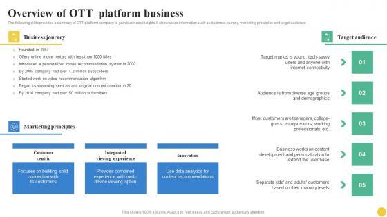 The following slide provides a summary of OTT platform company to gain business insights. It showcases information such as business journey, marketing principles and target audience. Presenting this PowerPoint presentation, titled Overview Of OTT Platform Business Ppt PowerPoint Presentation File Deck PDF, with topics curated by our researchers after extensive research. This editable presentation is available for immediate download and provides attractive features when used. Download now and captivate your audience. Presenting this Overview Of OTT Platform Business Ppt PowerPoint Presentation File Deck PDF. Our researchers have carefully researched and created these slides with all aspects taken into consideration. This is a completely customizable Overview Of OTT Platform Business Ppt PowerPoint Presentation File Deck PDF that is available for immediate downloading. Download now and make an impact on your audience. Highlight the attractive features available with our PPTs.