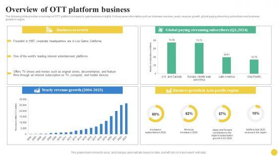 The following slide exhibits transformation of ott platform which reduces operating expenses and inefficiency. It presents information related to competitors, growth trends, etc. Persuade your audience using this OTT Platform Strategic Transformation From Dvd Rental To Live Streaming Information PDF. This PPT design covers five stages, thus making it a great tool to use. It also caters to a variety of topics including Competitors, Overall Impact, Business Model Cannibalization. Download this PPT design now to present a convincing pitch that not only emphasizes the topic but also showcases your presentation skills.