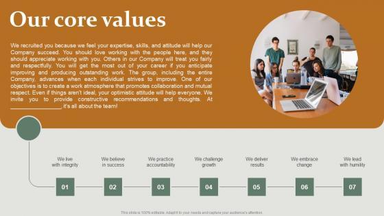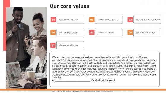 Create an editable Our Core Values HR Policy Overview Powerpoint Presentation Ppt Template Pdf that communicates your idea and engages your audience. Whether you are presenting a business or an educational presentation, pre-designed presentation templates help save time. Our Core Values HR Policy Overview Powerpoint Presentation Ppt Template Pdf is highly customizable and very easy to edit, covering many different styles from creative to business presentations. Slidegeeks has creative team members who have crafted amazing templates. So, go and get them without any delay. Our Our Core Values HR Policy Overview Powerpoint Presentation Ppt Template Pdf are topically designed to provide an attractive backdrop to any subject. Use them to look like a presentation pro.