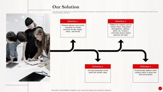 This slide caters to details about solutions rendered by the company to solve the issues mentioned by providing a visual discovery platform for finding ideas like recipes, home and style inspiration, and more. Make sure to capture your audiences attention in your business displays with our gratis customizable Our Solution Investor Funding Pitch Deck For Pinterests Expansion Microsoft Pdf. These are great for business strategies, office conferences, capital raising or task suggestions. If you desire to acquire more customers for your tech business and ensure they stay satisfied, create your own sales presentation with these plain slides. This slide caters to details about solutions rendered by the company to solve the issues mentioned by providing a visual discovery platform for finding ideas like recipes, home and style inspiration, and more.