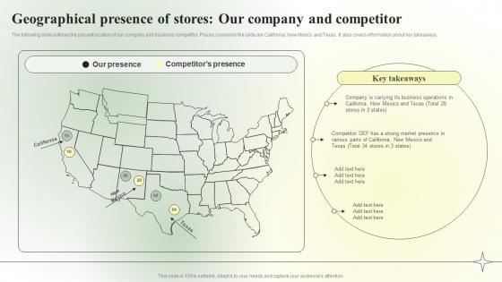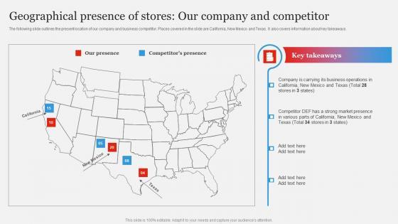 The following slide outlines the present location of our company and business competitor. Places covered in the slide are California, New Mexico and Texas. It also covers information about key takeaways. Are you in need of a template that can accommodate all of your creative concepts This one is crafted professionally and can be altered to fit any style. Use it with Google Slides or PowerPoint. Include striking photographs, symbols, depictions, and other visuals. Fill, move around, or remove text boxes as desired. Test out color palettes and font mixtures. Edit and save your work, or work with colleagues. Download Geographical Presence Of Stores Our Company And Competitor Slides PDF and observe how to make your presentation outstanding. Give an impeccable presentation to your group and make your presentation unforgettable.