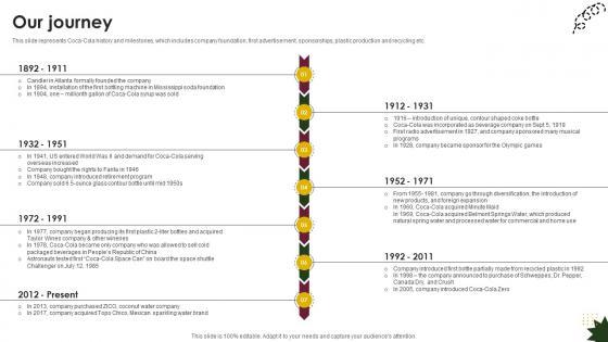 This slide represents Coca-Cola history and milestones, which includes company foundation, first advertisement, sponsorships, plastic production and recycling etc. Are you searching for a Our Journey Beverage Manufacturer Company Profile Ppt Slides CP SS V that is uncluttered, straightforward, and original Its easy to edit, and you can change the colors to suit your personal or business branding. For a presentation that expresses how much effort you have put in, this template is ideal With all of its features, including tables, diagrams, statistics, and lists, its perfect for a business plan presentation. Make your ideas more appealing with these professional slides. Download Our Journey Beverage Manufacturer Company Profile Ppt Slides CP SS V from Slidegeeks today. This slide represents Coca-Cola history and milestones, which includes company foundation, first advertisement, sponsorships, plastic production and recycling etc.