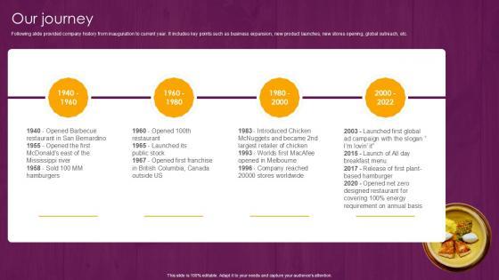 Following slide provided company history from inauguration to current year. It includes key points such as business expansion, new product launches, new stores opening, global outreach, etc. The Our Journey Food Retailer Company Profile Ppt Powerpoint CP SS V is a compilation of the most recent design trends as a series of slides. It is suitable for any subject or industry presentation, containing attractive visuals and photo spots for businesses to clearly express their messages. This template contains a variety of slides for the user to input data, such as structures to contrast two elements, bullet points, and slides for written information. Slidegeeks is prepared to create an impression. Following slide provided company history from inauguration to current year. It includes key points such as business expansion, new product launches, new stores opening, global outreach, etc.