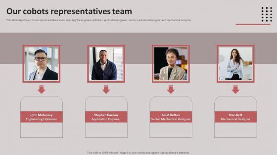 This slide depicts our cobots representatives team, including the engineer optimizer, application engineer, senior mechanical designer, and mechanical designer. Formulating a presentation can take up a lot of effort and time, so the content and message should always be the primary focus. The visuals of the PowerPoint can enhance the presenters message, so our Our Cobots Representatives Transforming Industries With Collaborative Robotics Guidelines Pdf was created to help save time. Instead of worrying about the design, the presenter can concentrate on the message while our designers work on creating the ideal templates for whatever situation is needed. Slidegeeks has experts for everything from amazing designs to valuable content, we have put everything into Our Cobots Representatives Transforming Industries With Collaborative Robotics Guidelines Pdf. This slide depicts our cobots representatives team, including the engineer optimizer, application engineer, senior mechanical designer, and mechanical designer.
