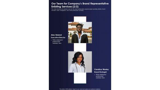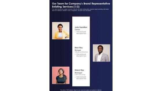 Presenting you an exemplary Our Team For Brand Representative Services One Pager Sample Example Document. Our one-pager comprises all the must-have essentials of an inclusive document. You can edit it with ease, as its layout is completely editable. With such freedom, you can tweak its design and other elements to your requirements. Download this Our Team For Brand Representative Services One Pager Sample Example Document brilliant piece now.