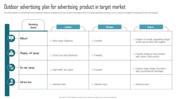 This slide outlines a comprehensive and localized promotional campaign for the new product in the target market. It includes advertising channels such as , billboard, shopping mall signage and bus stop signage. Slidegeeks is one of the best resources for PowerPoint templates. You can download easily and regulate Effective Product Adaptation Outdoor Advertising Plan For Advertising Product In Target Market Download PDF for your personal presentations from our wonderful collection. A few clicks is all it takes to discover and get the most relevant and appropriate templates. Use our Templates to add a unique zing and appeal to your presentation and meetings. All the slides are easy to edit and you can use them even for advertisement purposes. This slide outlines a comprehensive and localized promotional campaign for the new product in the target market. It includes advertising channels such as , billboard, shopping mall signage and bus stop signage.