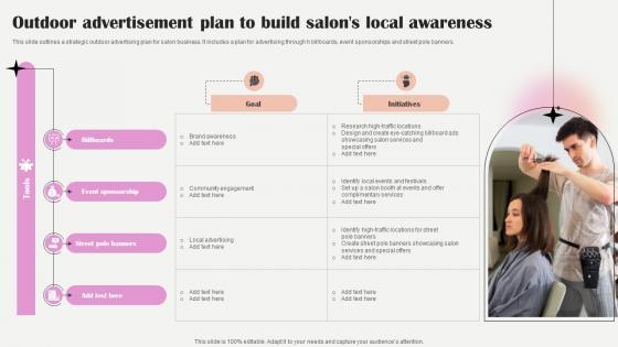 This slide outlines a strategic outdoor advertising plan for salon business. It includes a plan for advertising through h billboards, event sponsorships and street pole banners. Do you have an important presentation coming up Are you looking for something that will make your presentation stand out from the rest Look no further than Customizing The Salon Experience Outdoor Advertisement Plan To Build Salons Local Awareness Strategy SS V. With our professional designs, you can trust that your presentation will pop and make delivering it a smooth process. And with Slidegeeks, you can trust that your presentation will be unique and memorable. So why wait Grab Customizing The Salon Experience Outdoor Advertisement Plan To Build Salons Local Awareness Strategy SS V today and make your presentation stand out from the rest. This slide outlines a strategic outdoor advertising plan for salon business. It includes a plan for advertising through h billboards, event sponsorships and street pole banners.